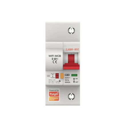 Interruptor Inteligente WiFi ( 2.4GHz ) Tipo Breaker ( Disyuntor ) de alta capacidad: 1 Polo 110V / 80A, con proteccion de Sobreconsumo ( sobrecarga ), Cortocircuito, Bajo Voltaje y Sobre-Voltaje. Compatible con Tuya / SmartLife.
